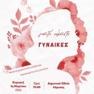 Μουσικοχορευτική εκδήλωση, αφιερωμένη στις γυναίκες με τίτλο “Γιατί είμαστε ΓΥΝΑΙΚΕΣ“ θα πραγματοποιηθεί την Κυριακή 1η Μαρτίου 2026, στις 19:00, στο Δημοτικό Ωδείο Λάρισας. Την εκδήλωση διοργανώνουν ο Δήμος Λαρισαίων, η Επιτροπή Ισότητας […]