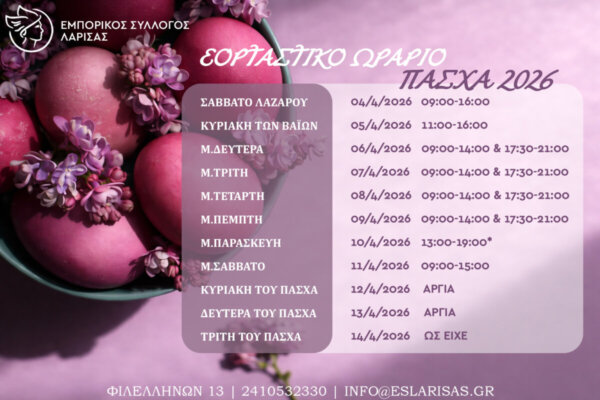 To θερινό ωράριο λειτουργίας των καταστημάτων – μελών του Εμπορικού Συλλόγου Λάρισας για το 2026