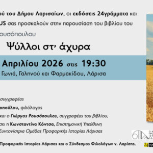 Το βιβλίο του Γιώργου Ρουσόπουλου «Ψύλλοι στ’ άχυρα», παρουσιάζουν την Πέμπτη, 23 Απριλίου 2026, στις 7.30 το απόγευμα, στη Λογοτεχνική Γωνιά, Γαληνού και Φαρμακίδου, Λάρισα, η Αντιδημαρχία Πολιτισμού του Δήμου Λαρισαίων, οι […]