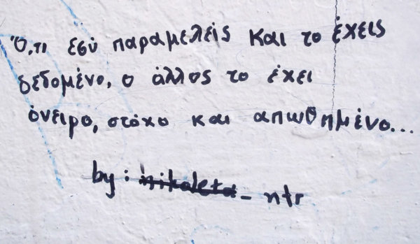 Κι εκεί που λες πως «πάει, χάθηκαν τα πάντα» και περπατάς με σκυμμένο το κεφάλι, το βλέμμα σου πέφτει σε ένα σύνθημα γραμμένο με σπρέι στο δρόμο.