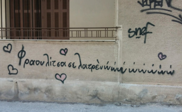 Μα δεν είναι το μόνο κι αυτό είναι το καλό. Οι τοίχοι της πόλης ανάμεσα στα διάφορα –συχνά δίχως νόημα- συνθήματα έχουν την πολυτέλεια να φιλοξενούν και συνθήματα αγάπης. Ναι αγάπης, αυτού του υπέροχου συναισθήματος. Κι εκφράζεται με κάθε τρόπο και σκέψη. Με εφευρετικότητα και στόμφο. Με δημιουργικότητα και φαντασία. Κι αν ξέρεις πως είναι για σένα τότε χαμογελάς. Κι αν πάλι, κατανοείς πως δεν αναφέρεται σε σένα, πάλι χαμογελάς καθώς σκέφτεσαι το ειδύλλιο. Θυμάσαι κάποια δική σου στιγμή και χαίρεσαι…
