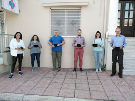 Στην Τροχαία Λάρισας. Τις μάσκες παρέλαβε ο Δκτης Τροχαίας κ. Σ. Καφετζής. Για το Σύλλογο Μαραθωνοδρόμων Νομού Λάρισας παρευρέθηκαν οι Γούλας Α., Γκέτσιος Κ., Γούλας Ν.
