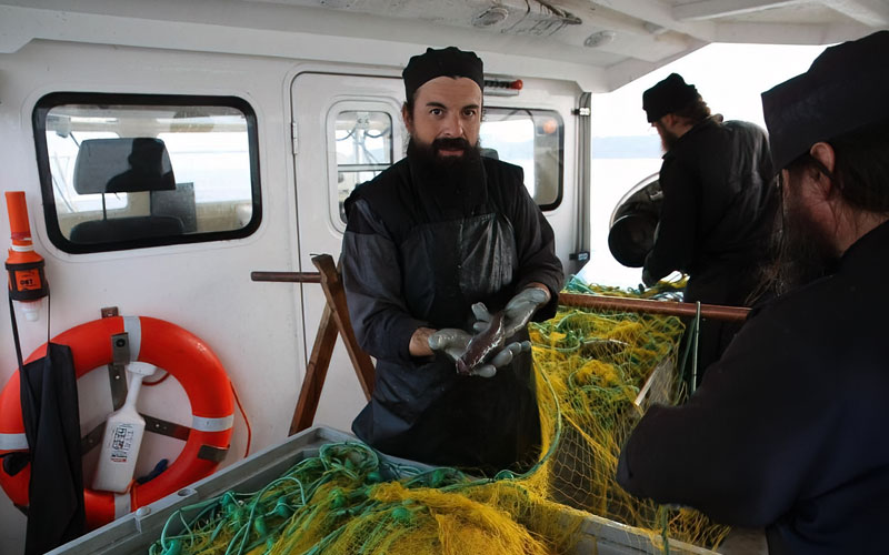Πολλοί μοναχοί στο Άγιο Όρος ασχολούνται με το ψάρεμα. Σε όλες τις Ιερές Μονές, σε όλες τις Σκήτες, υπάρχουν αρκετές βάρκες, από 2,5 μέτρα μέχρι και 15 μέτρα! Οι πατέρες ασχολούνται κυρίως με τα δίχτυα και τα παραγάδια, ενώ ορισμένοι επιδίδονται στη συρτή και στο jigging. Ακόμη και με το καλάμι από την ακτή ψαρεύουν μερικοί, κυρίως αυτοί που δεν έχουν βάρκα.