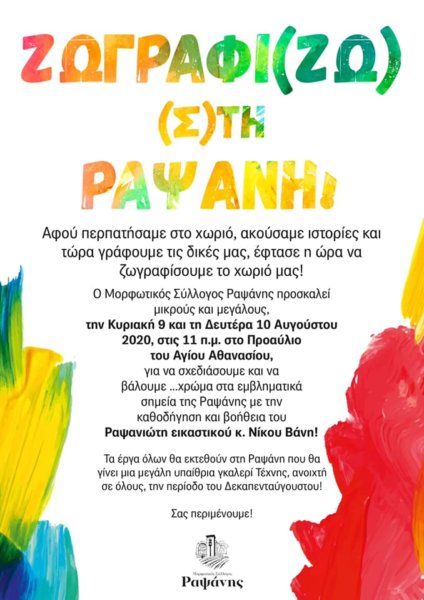 Αφού περπατήσανε στο χωριό, ακούσανε ιστορίες και τώρα γράφουνε τις δικές τους, έφτασε η ώρα να ζωγραφίσουνε το χωριό μας! Ο Μορφωτικός Σύλλογος Ραψάνης προσκαλεί μικρούς και μεγάλους, την Κυριακή 9 και τη Δευτέρα 10 Αυγούστου 2020, στις 11π.μ. στο Προαύλιο του Αγίου Αθανασίου, για να σχεδιάσουμε και να βάλουμε …χρώμα στα εμβληματικά σημεία της Ραψάνης με την καθοδήγηση και βοήθεια του Ραψανιώτη εικαστικού κ. Νίκου Βάνη!