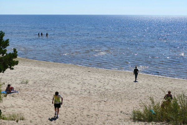 Αποφασίζουμε να συνεχίσουμε τον δρόμο 32 προς της λίμνη, αφού ο χάρτης δείχνει ότι συνεχίζει να είναι όμορφη η διαδρομή. Αυτό είναι αλήθεια! Φτάνουμε στη λίμνη και βλέπουμε την ταμπέλα που δείχνει ότι το τελευταίο χωριό της χώρας, Vasknarva, στα σύνορα με τη Ρωσία, είναι μόλις 3 χιλιόμετρα αντίθετα από την πορεία μας. Φυσικά και πάμε. Φτάνουμε γρήγορα. Το χωριό βρίσκεται από την μία πλευρά του ποταμού Narva, που αποτελεί και το φυσικό σύνορο. Μας κάνουν πολύ μεγάλη εντύπωση τα πολύ όμορφα σπιτάκια του χωριού, όπως και η υπερμεγέθης εκκλησία του χωριού. Ψάχνουμε μία καλή θέα προς την απέναντι όχθη. Στο τέλος του δρόμου τη βρίσκουμε και φωτογραφίζουμε την τεράστια Ρωσική σημαία που βλέπουμε απέναντι. Δύο ηλικιωμένες κυρίες που ετοιμάζονται να κάνουν τη βόλτα τους με το αυτοκίνητο μας κοιτούν με περιέργεια. Παίρνουμε το δρόμο προς τα πίσω, οδηγώντας δίπλα στη λίμνη, με κατεύθυνση το κάστρο Alatskivi. Ο δρόμος αρχίζει να έχει αρκετή κίνηση. Πολύ γρήγορα καταλαβαίνουμε ότι λόγω του ότι σήμερα είναι Κυριακή, αρκετοί Εσθονοί που ζουν κοντά στην περιοχή αυτή, έχουν έρθει για το μπάνιο τους. Ο δρόμος είναι πάρα πολύ όμορφος, μέσα στα δέντρα, ενώ κατά διαστήματα βλέπουμε μικρούς οικισμούς μέσα στο δάσος, με μικρά σπιτάκια και στέγες που φτάνουν μέχρι το έδαφος. Φυσικά και βρίσκουμε ένα σημείο και σταματάμε για να περπατήσουμε μέχρι τη λίμνη. Είμαστε περίεργοι πως είναι. Βλέπουμε μία αμμουδερή παραλία και όσο πιάνει το μάτι μας έχει κόσμο. Η λίμνη δεν είναι τόσο καθαρή, όμως αυτό δεν δείχνει να απασχολεί κανέναν εδώ. Κάνουν κανονικά μπάνιο και τα παιδιά παίζουν στα νερά της.