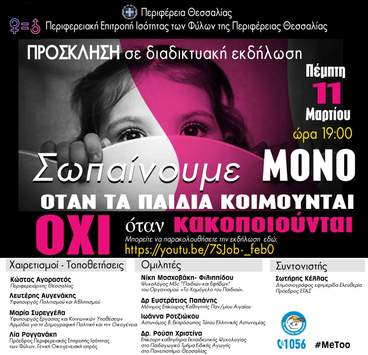 Την Πέμπτη 11 Μαρτίου ώρα 19:00 η Περιφερειακή Επιτροπή Ισότητας των Φύλων της Περιφέρειας Θεσσαλίας, διοργανώνει ανοιχτή διαδικτυακή εκδήλωση υπό την αιγίδα της Περιφέρειας Θεσσαλίας, με θέμα «Σωπαίνουμε όταν τα παιδιά κοιμούνται ΟΧΙ όταν κακοποιούνται»
