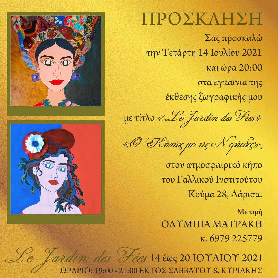 Το Γαλλικό Ινστιτούτο φιλοξενεί τη νέα έκθεση ζωγραφικής της Ολυμπίας Ματράκη με τίτλο “Le Jardin des Fées” – «Ο Κήπος με τις Νεράιδες», στον ατμοσφαιρικό κήπο του από την Τετάρτη 14 Ιουλίου έως την Τρίτη 20 Ιουλίου 2021.