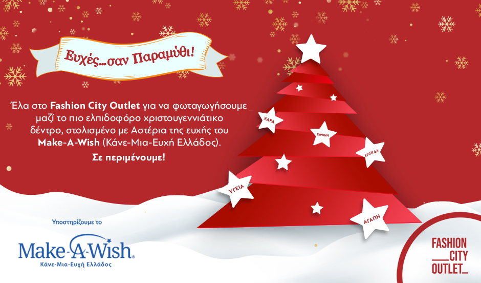 Στο περίπτερο που θα βρίσκεται δίπλα στο Χριστουγεννιάτικο Δέντρο, θα μπορεί όποιος θέλει να προμηθεύεται τα αστεράκια των ευχών που πουλάει κάθε χρόνο το “Make A Wish” για να ενισχύσει το έργο του. Οι πελάτες του Εκπτωτικού Κέντρου θα μπορούν είτε να πάρουν τα αστεράκια για το δέντρο του σπιτιού τους, είτε να προσθέσουν ένα στολίδι με την ευχή τους στο δέντρο του Fashion City Outlet!