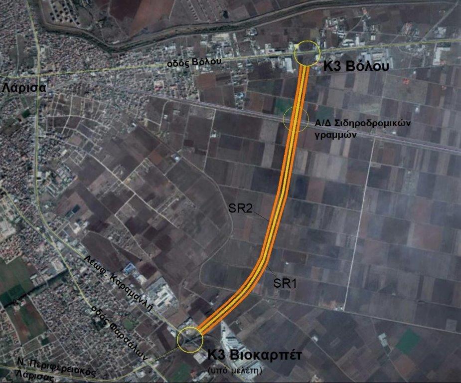 Η μελέτη Τμήμα από Ι/Κ π.ε.ο. Βόλου έως κόμβο Βιοκαρπέτ είναι το δεύτερο τμήμα της Ανατολικής Παράκαμψης Λάρισας (μετά το τμήμα από π.ε.ο. Βόλου μέχρι την π.ε.ο. Αθηνών- Θεσσαλονίκης στο ύψος του κυκλικού κόμβου Αγιάς) και αποτελεί νέα χάραξη που παρακάμπτει μέρος του αστικού οδικού τμήματος της Π.Ε.Ο Λάρισας – Βόλου, και της Π.Ε.Ο Λάρισας -Αθηνών. Πρόκειται για πλήρη μελέτη οδικού τμήματος μήκους 4 χλμ, διαχωρισμένης κυκλοφορίας, δύο λωρίδων ανά κατεύθυνση, παράπλευρου δικτύου εκατέρωθεν της αρτηρίας, πλήρη μελέτη ενός ισόπεδου κυκλικού στην οδό Βόλου, πλήρη μελέτη δύο τεχνικών γεφύρωσης τάφρου και Α/Δ της αρτηρίας από τις σιδηροδρομικές γραμμές.