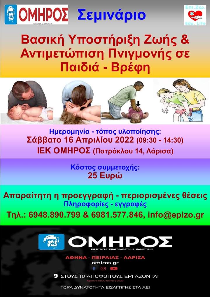 Το Σάββατο 16 Απριλίου 2022 το Πρωί (09:30 – 14:30), θα υλοποιηθεί το σεμινάριο ¨Βασική Υποστήριξη Ζωής & Αντιμετώπιση πνιγμονής σε Παιδιά & Βρέφη¨, στο ΙΕΚ ΟΜΗΡΟΣ στη Λάρισα (Πατρόκλου 14).