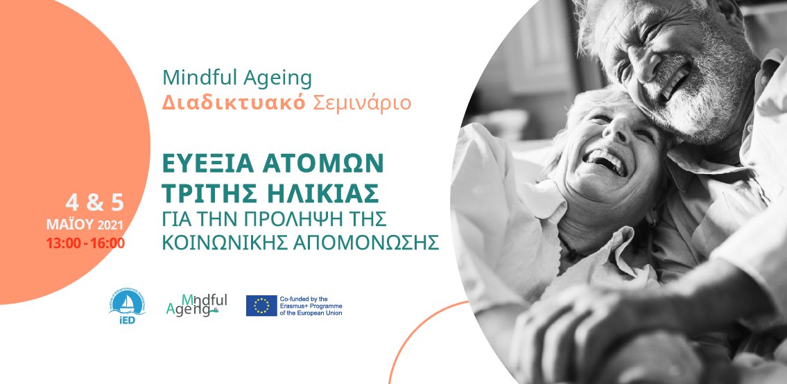 Το Ινστιτούτο Ανάπτυξης Επιχειρηματικότητας σας προσκαλεί να συμμετέχετε στο ΔΩΡΕΑΝ Διαδικτυακό Σεμινάριο με τίτλο «Ευεξία Ατόμων Τρίτης Ηλικίας για την Πρόληψη της Κοινωνικής Απομόνωσης», την Τετάρτη 4 & την Πέμπτη 5 Μαΐου, από τις 13:00μ.μ. έως τις 16:00 μ.μ., στο πλαίσιο του ευρωπαϊκού έργου «MindfulAgeing».