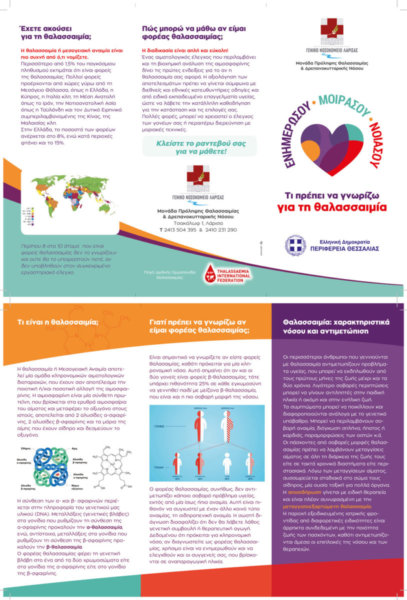 Το προσωπικό της Μονάδας Πρόληψης Θαλασσαιμίας του ΓΝΛ μαζί με εθελοντές θα βρίσκονται στην Πλατεία Ταχυδρομείου από τις 10 το πρωί μέχρι τις 3 το μεσημέρι μοιράζοντας έντυπο υλικό για την ενημέρωση και την ευαισθητοποίηση των πολιτών σχετικά με τη θαλασσαιμία ή μεσογειακή αναιμία.