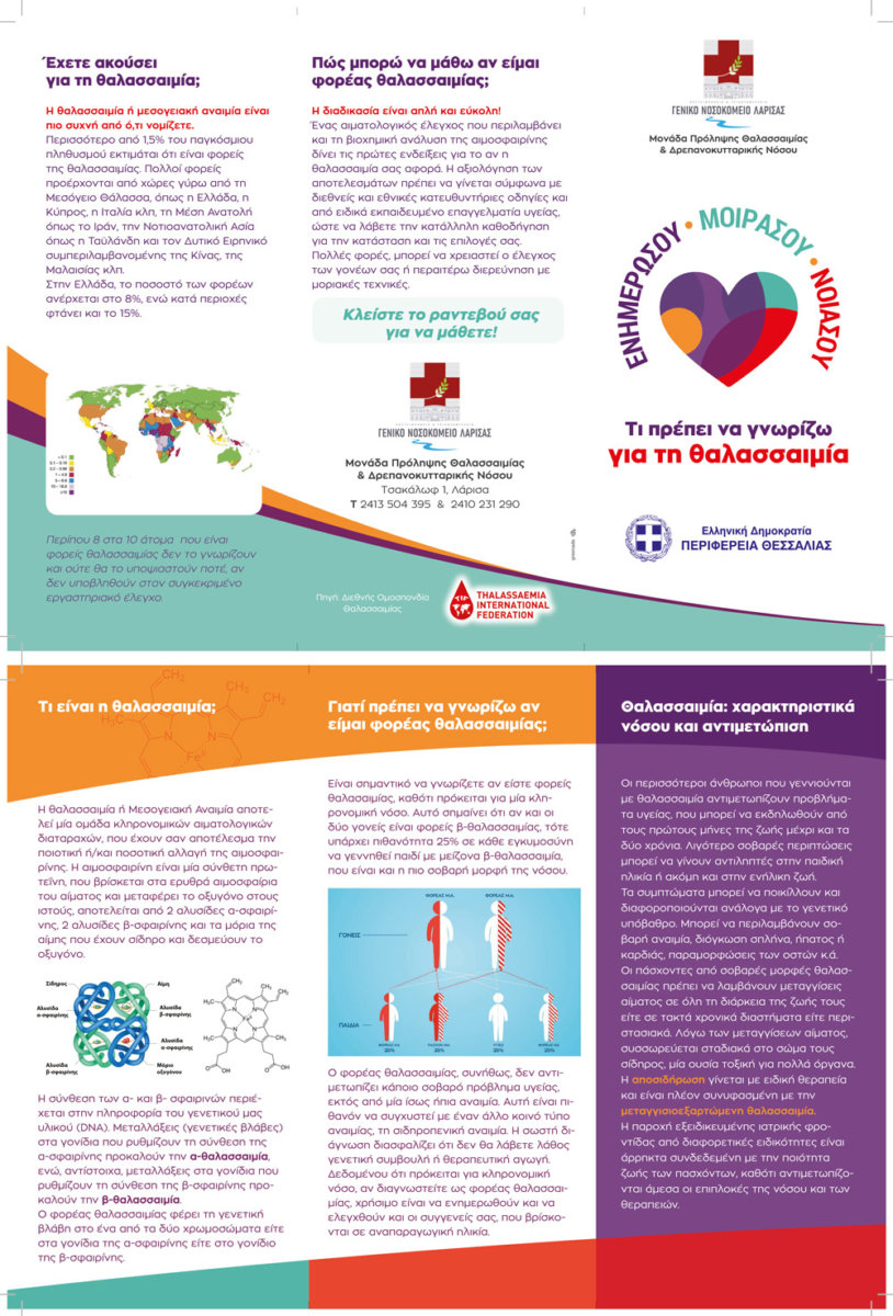 Με αφορμή την Παγκόσμια Ημέρα Θαλασσαιμίας, το Γενικό Νοσοκομείο Λάρισας σε συνεργασία με την Περιφέρεια Θεσσαλίας διοργανώνουν ενημερωτική εκδήλωση το Σαββατοκύριακο 7 και 8 Μαΐου 2022, στην πλατεία Ταχυδρομείου στη Λάρισα.
