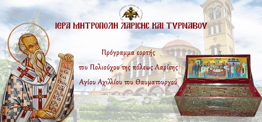 19:00μ.μ.: Αρχιερατικός Εσπερινός στην παλαιά Βασιλική του Αγίου Αχιλλίου στο Φρούριο Λαρίσης, χοροστατούντος του Σεβ. Μητροπολίτου Λαρίσης και Τυρνάβου κ. Ιερωνύμου. Ακολούθως, θα σχηματιστεί λιτανευτική πομπή με κατεύθυνση τον Μητροπολιτικό Ναό, όπου θα ανοιγεί προς προσκύνηση των εν αυτή Ιερών Λειψάνων η Λάρνακα του Αγίου και θα τελεστεί Ιερά Αγρυπνία, ιερουργούντος του Πρωτοσυγκέλλου της Μητροπόλεως, Αρχιμ. κ. Ιγνατίου Μουρτζανού.