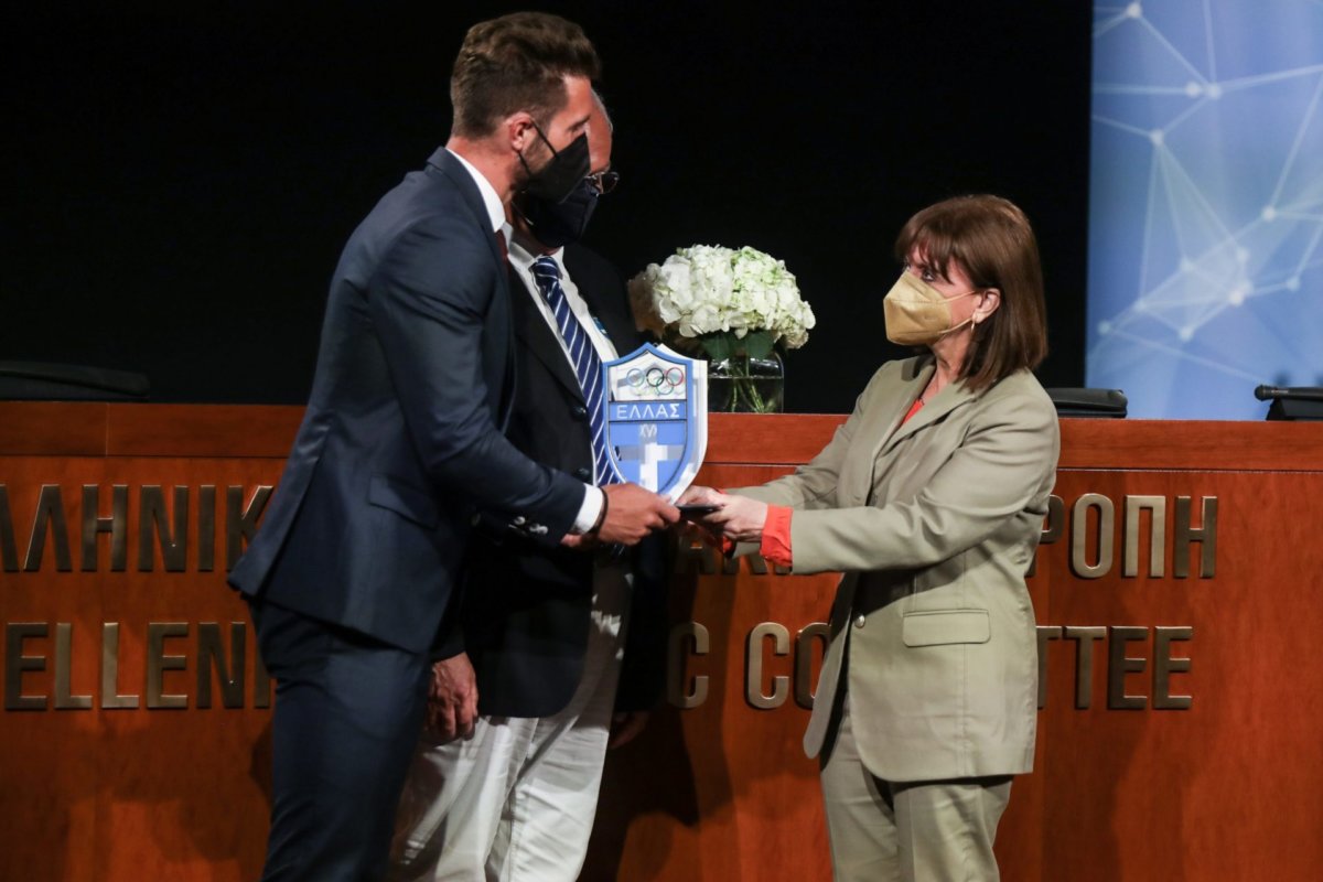 Η Πρόεδρος της Δημοκρατίας Κατερίνα Σακελλαροπούλου παρέστη στην Ετήσια Εκδήλωση Τιμητικών Βραβεύσεων της Ελληνικής Ολυμπιακής Επιτροπής για τις αθλήτριες, τους αθλητές και τους προπονητές που διακρίθηκαν το 2021. Η κυρία Σακελλαροπούλου απένειμε βραβείο στον Ολυμπιονίκη Στέφανο Ντούσκο, ο οποίος κατέκτησε το χρυσό μετάλλιο στην κωπηλασία, στους 32ους Ολυμπιακούς Αγώνες του Τόκυο, και στον προπονητή του Giovanni Postiglione.