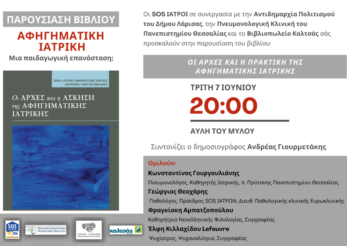 Οι SOS ΙΑΤΡΟΙ σε συνεργασία με την Αντιδημαρχία Πολιτισμού και Επιστημών του Δήμου Λαρισαίων, την Πνευμονολογική Κλινική του Πανεπιστημίου Θεσσαλίας και το Βιβλιοπωλείο Καλτσάς, διοργανώνουν την παρουσίαση του βιβλίου «Οι Αρχές και η Άσκηση της Αφηγηματικής Ιατρικής»,