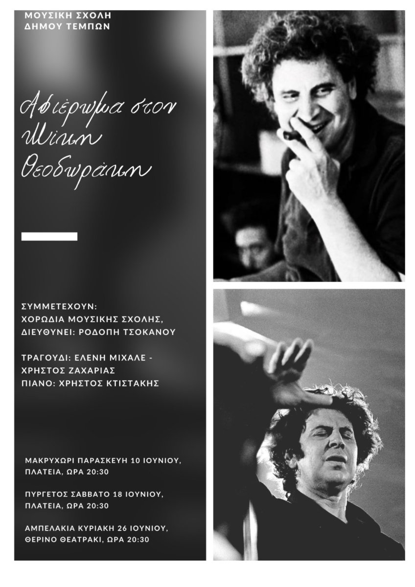 Ο Δήμος Τεμπών σας προσκαλεί να παρακολουθήσετε τις θερινές επικείμενες συναυλίες της Μουσικής Σχολής Συκουρίου με αφιέρωμα στον Μίκη Θεοδωράκη. Διευθύνει η κα Ροδόπη Τσόκανου. Τραγουδούν η κα. Ελένη Μιχαλέ και ο κ. Χρήστος Παπαζαχαρίας. Στο πιάνο είναι ο κ. Χρήστος Κτιστάκης. Οι συναυλίες ξεκινούν από του Μακρυχώρι στις 10/06, συνεχίζουν στον Πυργετό στις 18/06 και ολοκληρώνονται στα Αμπελάκια στις 26/06. Σας περιμένουμε όλους!