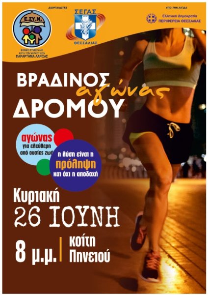 Την Κυριακή 26 Ιουνίου, στις 8 το βράδυ στην κοίτη του Πηνειού στη Λάρισα τρέχουμε για να βγούμε πρώτοι στη ζωή, στον Βραδινό Αγώνα Δρόμου κατά των ναρκωτικών και των εξαρτήσεων που διοργανώνει το Εθνικό Συμβούλιο κατά των Ναρκωτικών – Παράρτημα Λάρισας και ο ΣΕΓΑΣ Θεσσαλίας υπό την αιγίδα της Περιφέρειας Θεσσαλίας και με τη συμμετοχή της Περιφερειακής Διεύθυνσης Εκπαίδευσης Θεσσαλίας.