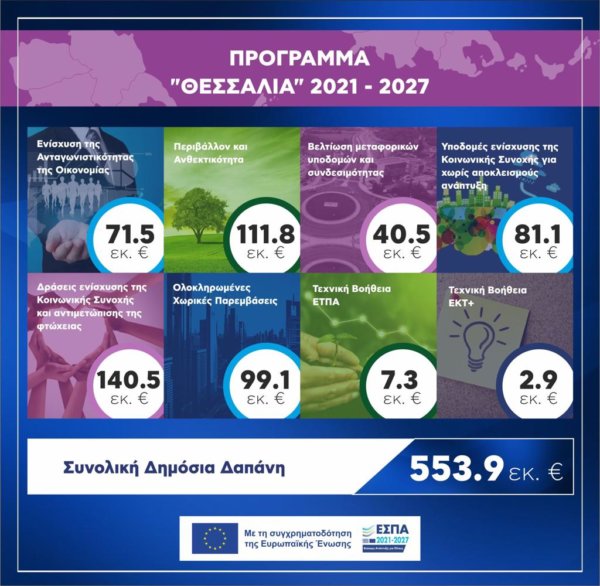 Ο προϋπολογισμός του νέου Περιφερειακού Επιχειρησιακού Προγράμματος ΠΕΠ Θεσσαλίας 2021-2027 ανέρχεται σε 553,9 εκατομμύρια ευρώ, με 80% συγχρηματοδότηση από την Ευρωπαϊκή Ένωση, εκ των οποίων: 410,4 εκατ. ευρώ από το Ευρωπαϊκό Ταμείο Περιφερειακής Ανάπτυξης (ΕΤΠΑ) και 143,5 εκατ. ευρώ από το Ευρωπαϊκό Κοινωνικό Ταμείο (ΕΚΤ). Οι πόροι του νέου ΠΕΠ Θεσσαλίας 2021-2027 είναι ενισχυμένοι κατά 31% σε σχέση με το ΠΕΠ Θεσσαλίας 2014-2020. Πρόσθετοι πόροι πρόκειται να εισρεύσουν στη Θεσσαλία τη Νέα Προγραμματική Περίοδο για έργα και δράσεις με χρηματοδότηση από τα Τομεακά Προγράμματα ΕΣΠΑ, το Πρόγραμμα Αγροτικής Ανάπτυξης (ΠΑΑ), το Ταμείο Ανάκαμψης και το Εθνικό Πρόγραμμα Ανάπτυξης (ΕΠΑ) 2021-2025.