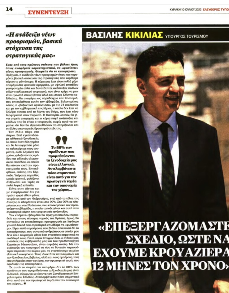 Στα αποτελέσματα της στρατηγικής που χαράχτηκε το περασμένο φθινόπωρο με βασικούς στόχους την επιμήκυνση της τουριστικής περιόδου και την ανάδειξη νέων ταξιδιωτικών προορισμών αναφέρθηκε ο Υπουργός Τουρισμού Βασίλης Κικίλιας σε συνέντευξη που παραχώρησε στην εφημερίδα «Ελεύθερος Τύπος της Κυριακής» και στον δημοσιογράφο Χάρη Ντιγριντάκη.
