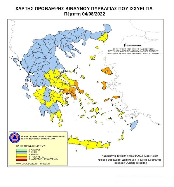 Πολύ υψηλός κίνδυνος πυρκαγιάς (κατηγορία κινδύνου 4), προβλέπεται για σήμερα Πέμπτη 4 Αυγούστου στην Περιφέρεια Βορείου Αιγαίου (ΠΕ Λέσβου, ΠΕ Χίου, ΠΕ Σάμου, ΠΕ Ικαρίας) στην Περιφέρεια Αττικής και στην Περιφέρεια Στερεάς Ελλάδας (ΠΕ Εύβοιας), σύμφωνα με το Χάρτη Πρόβλεψης Κινδύνου Πυρκαγιάς που εκδίδει η Γενική Γραμματεία Πολιτικής Προστασίας του Υπουργείου Κλιματικής Κρίσης & Πολιτικής Προστασίας.