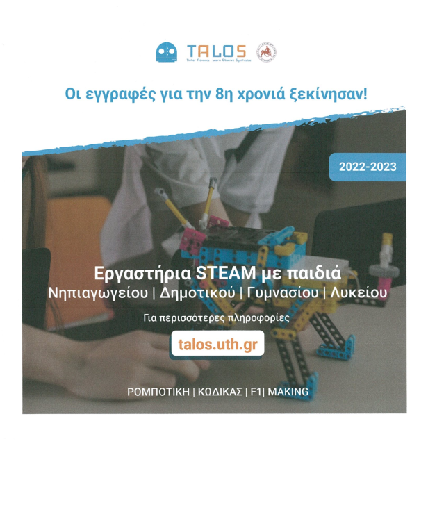 Για 8η συνεχόμενη χρονιά στην πόλη του Βόλου αλλά και στην ευρύτερη περιοχή, παιδιά διαφόρων ηλικιών έχουν την ευκαιρία να συμμετέχουν συστηματικά σε πληθώρα καινοτόμων δράσεων κι εργαστηρίων που υλοποιούνται στο πλαίσιο του αυτοχρηματοδοτούμενου έργου TALOS του Πανεπιστημίου Θεσσαλίας.