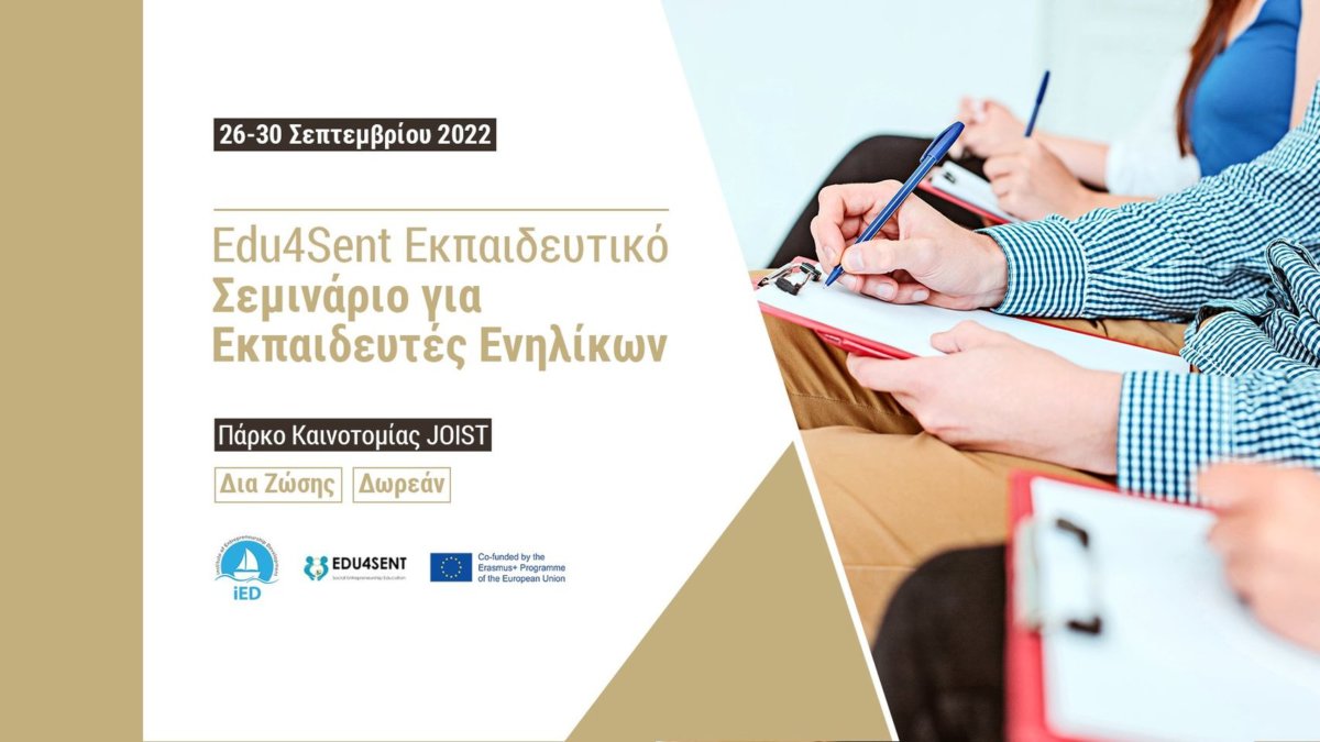 Το Ινστιτούτο Ανάπτυξης Επιχειρηματικότητας σας προσκαλεί στο δωρεάν εκπαιδευτικό πρόγραμμα διάρκειας 5 ημερών, που θα πραγματοποιηθεί δια ζώσης από τη Δευτέρα 26 Σεπτεμβρίου έως την Παρασκευή 30 Σεπτεμβρίου 2022 από τις 10:00 π.μ. έως τις 14:00 μ.μ., στο Πάρκο Καινοτομίας JOIST, Βαλτετσίου και Τριπόλεως στη Λάρισα. Το εκπαιδευτικό πρόγραμμα διοργανώνεται στο πλαίσιο του ευρωπαϊκού έργου Edu4sent.