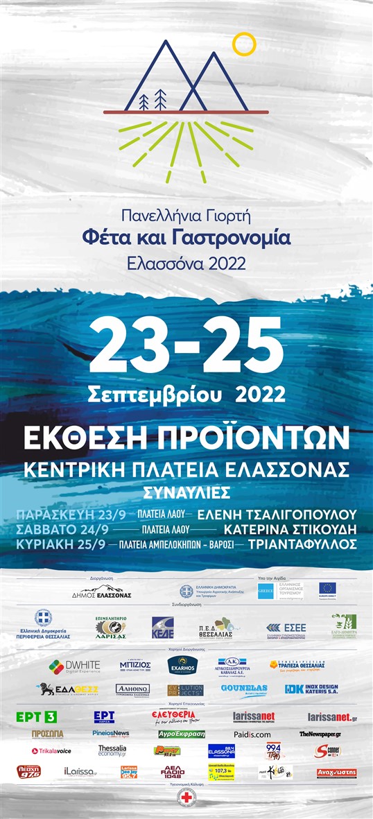 Ξεκινάει αύριο Παρασκευή 23 Σεπτεμβρίου η Πανελλήνια Γιορτή «Φέτα και Γαστρονομία, Ελασσόνα 2022» και ο Δήμος Ελασσόνας υποδέχεται με ιδιαίτερη χαρά τους επισκέπτες στην Κεντρική Πλατεία Ελασσόνας, όπου έχει διαμορφωθεί ο χώρος για τους εκθέτες φέτας, κρασιού, κρέατος, μελιού και άλλων τοπικών προϊόντων.