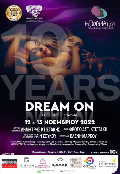 Το γυναικείο φωνητικό σύνολο «InDonnatión» του Δημοτικού Ωδείου Λάρισας, υπό την αιγίδα της Αντιδημαρχίας Πολιτισμού και Επιστημών, παρουσιάζει την επετειακή της συναυλία σε διεύθυνση του μαέστρου Δημήτρη Κτιστάκη, στην αίθουσα συναυλιών του Δημοτικού Ωδείου Λάρισας στις 12 και 13 Νοέμβρη 2022, στις 20:30.