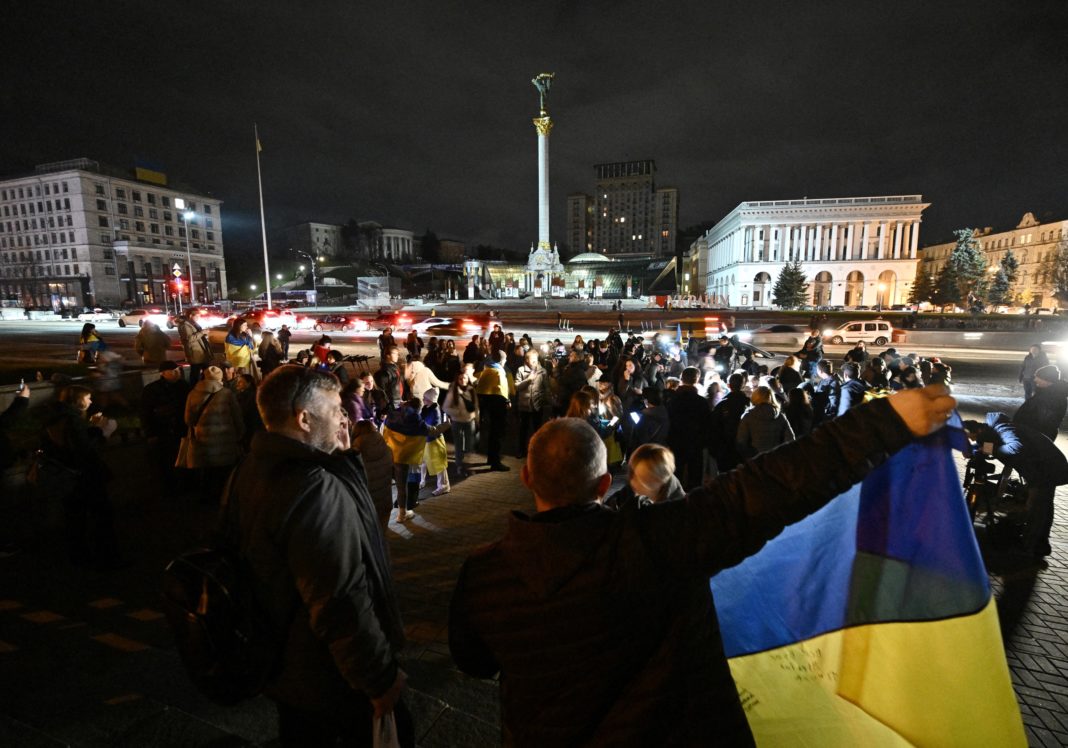 Ο ουκρανικός εθνικός ύμνος αντηχούσε ολόκληρη τη νύχτα στην κεντρική πλατεία της Χερσώνας, καθώς ένα μικρό πλήθος τραγουδούσε ενώ ήταν μαζεμένο γύρω από μια φωτιά, μετά την απόσυρση των στρατευμάτων της Ρωσίας από την πόλη.