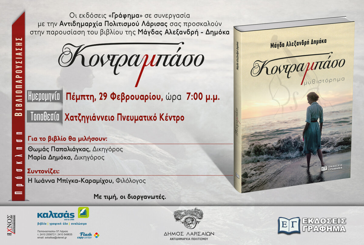 “Κόντραμπασο” είναι ο τίτλος του βιβλίου της Μάγδας Αλεξανδρή-Δημόκα που θα παρουσιάσουν οι Εκδόσεις Γράφημα σε συνεργασία με την Αντιδημαρχία Πολιτισμού Λάρισας, την Πέμπτη, 29 Φεβρουαρίου, ώρα 19.00, στο Χατζηγιάννειο Πνευματικό Κέντρο Λάρισας. Για το βιβλίο θα μιλήσουν οι:: Θωμάς Παπαλιάγκας – Δικηγόρος και Μαρία Δημόκα – Δικηγόρος