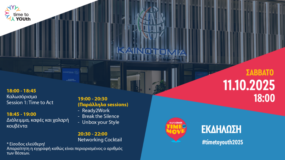 Το Σάββατο 11 Oκτωβρίου 2025 και ώρα 18:00, το Κέντρο Δια Βίου Μάθησης ΚΑΙΝΟΤΟΜΙΑ προσκαλεί όλους τους νέους και τις νέες στις εγκαταστάσεις του, Δήμητρας & Νίκης, στην εκδήλωση “Time to Youth” που πραγματοποιείται και φέτος για 4η συνεχόμενη χρονιά.