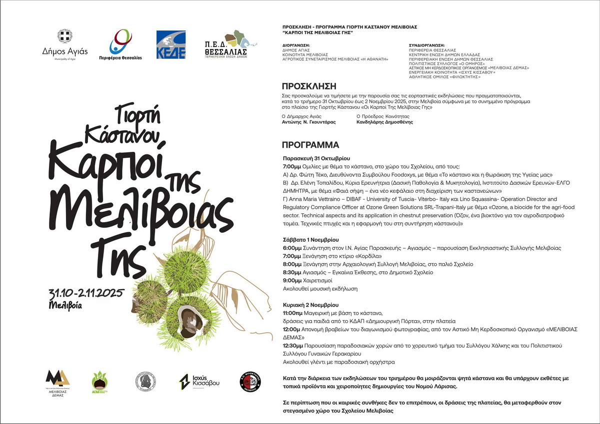 Η Εφορεία Αρχαιοτήτων Λάρισας συμμετέχει στον εορτασμό με την παρουσίαση της Εκκλησιαστικής Συλλογής του Ι.Ν. Αγίας Παρασκευής Μελιβοίας καθώς και της Αρχαιολογικής Συλλογής στο Παλιό Σχολείο Μελιβοίας. Η παρουσίαση των δύο εκθέσεων θα γίνει το Σάββατο 1η Νοεμβρίου και ώρα 6 μ.μ.
