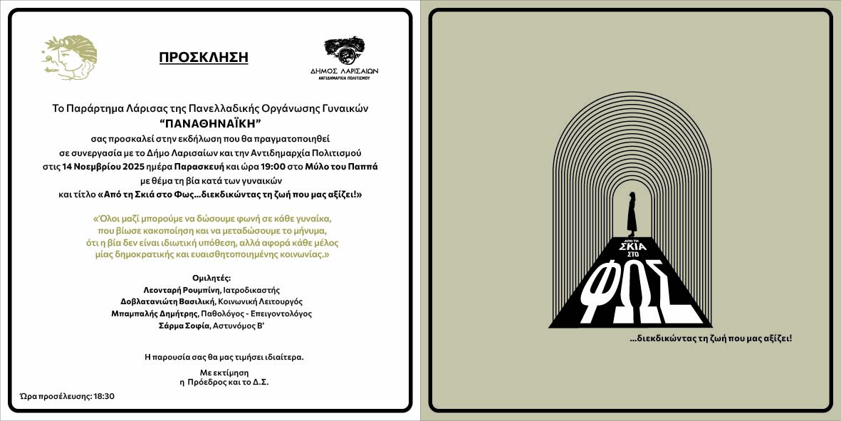 Το Παράρτημα Λάρισας της Πανελλαδικής Οργάνωσης Γυναικών «ΠΑΝΑΘΗΝΑΪΚΗ» πραγματοποιεί την πρώτη του εκδήλωση με τίτλο «Από τη σκιά στο φως… διεκδικώντας τη ζωή που μας αξίζει!», την Παρασκευή 14 Νοεμβρίου 2025, στις 19:00, στον Μύλο του Παππά, με θέμα τη βία κατά των γυναικών.