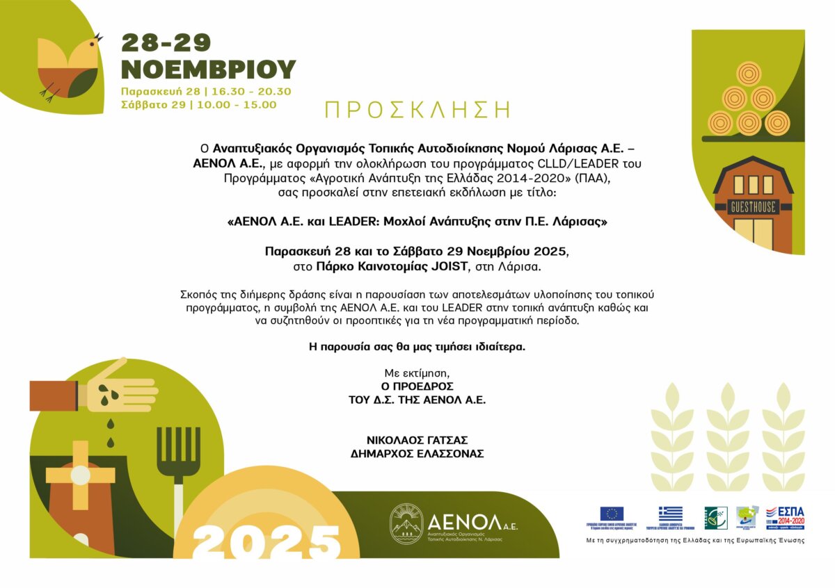 Ο Αναπτυξιακός Οργανισμός Τοπικής Αυτοδιοίκησης Νομού Λάρισας Α.Ε. – ΑΕΝΟΛ Α.Ε., με αφορμή την ολοκλήρωση του προγράμματος CLLD/LEADER του Προγράμματος «Αγροτική Ανάπτυξη της Ελλάδας 2014-2020» (ΠΑΑ), διοργανώνει επετειακή εκδήλωση με τίτλο «ΑΕΝΟΛ και LEADER: Μοχλοί Ανάπτυξης στην Π.Ε. Λάρισας», στο πλαίσιο εμψύχωσης του τοπικού πληθυσμού και των ενεργειών προβολής του τοπικού προγράμματος CLLD/LEADER και την παρουσίαση των αποτελεσμάτων του.