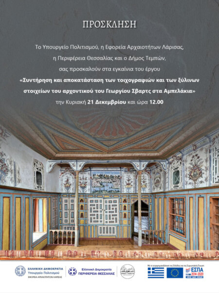 Την Κυριακή 21 Δεκεμβρίου 2025 στις 12.00 το μεσημέρι θα τελεσθούν τα επίσημα εγκαίνια του Αρχοντικού του Γεωργίου Σβαρτς στα Αμπελάκια, μετά την ολοκλήρωση των εκτεταμένων εργασιών συντήρησης και ανάδειξης του μνημείου, που πραγματοποιήθηκαν με τη χρηματοδότηση του ΕΣΠΑ Θεσσαλίας 2014-2020.
