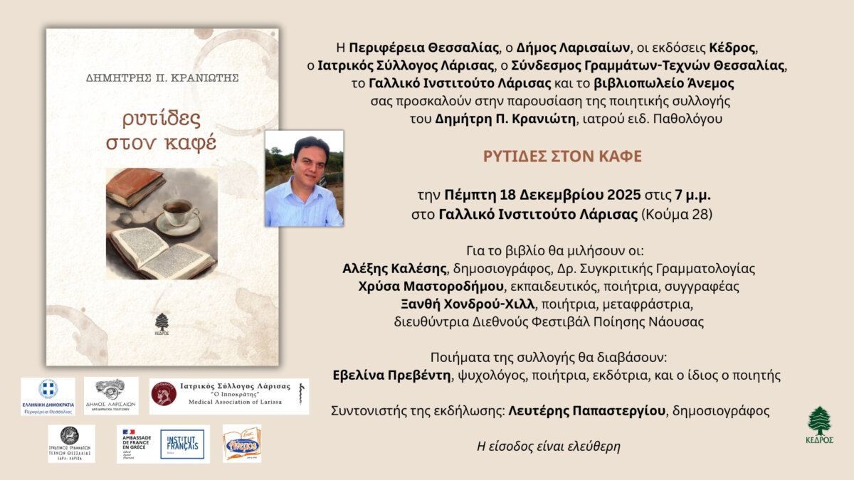 Τη νέα ποιητική συλλογή του Δημήτρη Π. Κρανιώτη «Ρυτίδες στον καφέ», παρουσιάζουν την Πέμπτη 18 Δεκεμβρίου 2025 στις 7:00μ.μ. στο Γαλλικό Ινστιτούτο Λάρισας (Κούμα 28), η Περιφέρεια Θεσσαλίας, η Αντιδημαρχία Πολιτισμού του Δήμου Λαρισαίων, οι εκδόσεις Κέδρος, ο Ιατρικός Σύλλογος Λάρισας, ο Σύνδεσμος Γραμμάτων-Τεχνών Θεσσαλίας, το Γαλλικό Ινστιτούτο Λάρισας και το βιβλιοπωλείο «Άνεμος».