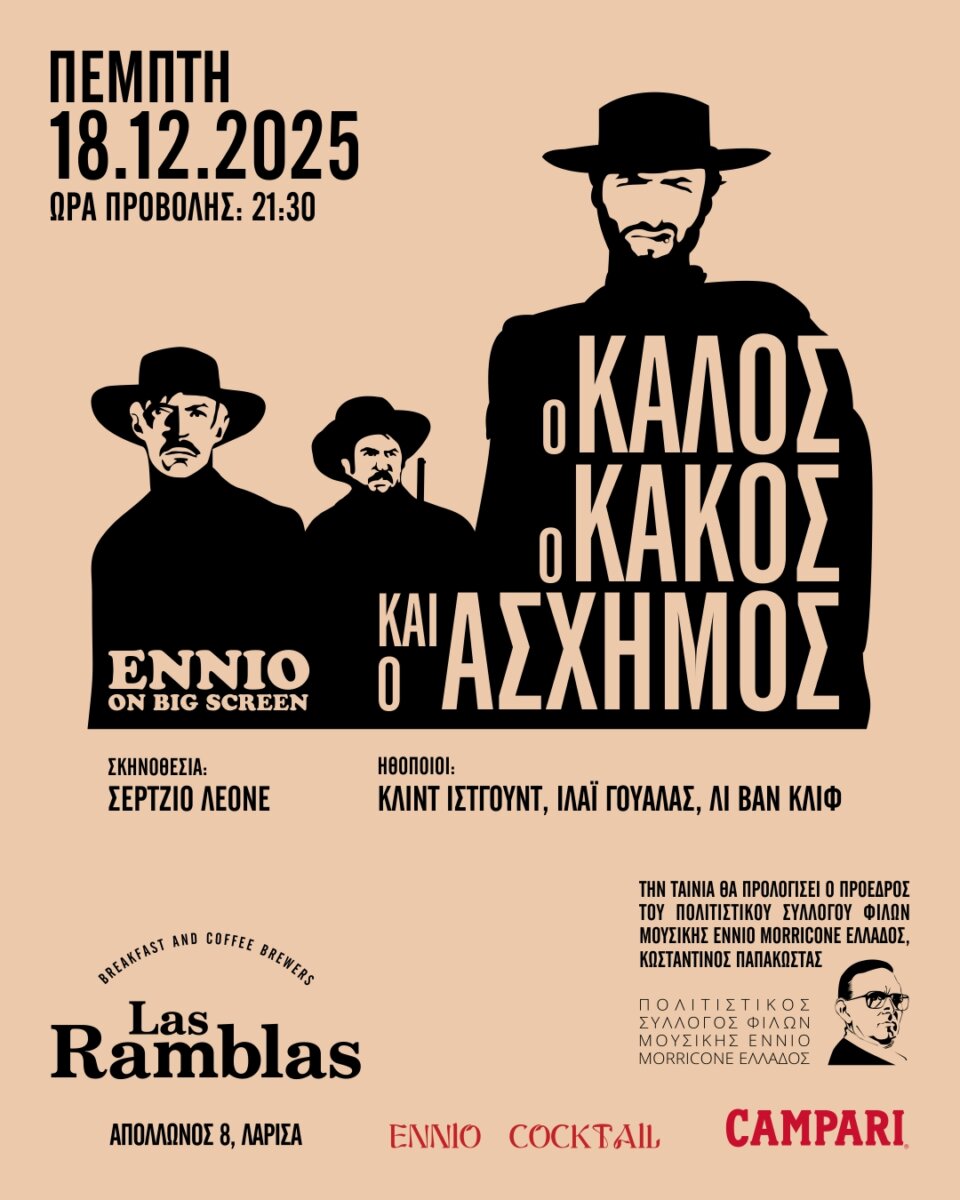 Η Ομάδα Προβολών “Ennio On Big Screen”, σε συνεργασία με τον Πολιτιστικό Σύλλογο Φίλων Μουσικής Ennio Morricone Ελλάδος, παρουσιάζει την κινηματογραφική ταινία «Ο Καλός, ο Κακός και ο Άσχημος» στο Las Ramblas.