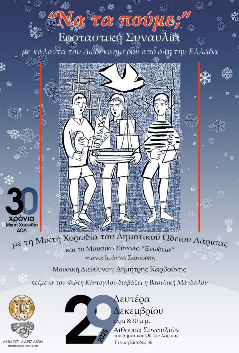 Μια ξεχωριστή χριστουγεννιάτικη συναυλία, αφιερωμένη στο πνεύμα των ημερών και στον πλούτο της ελληνικής παράδοσης, δίνει η Μικτή Χορωδία του Δημοτικού Ωδείου Λάρισας με τη συμμετοχή του Μουσικού Συνόλου «Ενωδεία», την Δευτέρα 29 Δεκεμβρίου και ώρα 8:30 μ. μ. στην Αίθουσα Συναυλιών του ΔΩΛ. Η συναυλία, που φιλοδοξεί να ταξιδέψει τους ακροατές σε ήχους, λόγο και εικόνες της ελληνικής χριστουγεννιάτικης παράδοσης, πραγματοποιείται στο πλαίσιο των εκδηλώσεων που διοργανώνουν η Αντιδημαρχία Πολιτισμού του Δήμου Λαρισαίων και το Δημοτικό Ωδείο Λάρισας για τις γιορτινές μέρες των Χριστουγέννων και της Πρωτοχρονιάς.