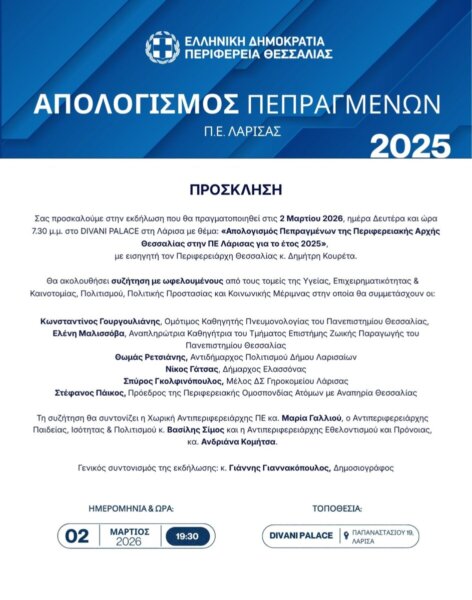Η Περιφέρεια Θεσσαλίας διοργανώνει εκδήλωση με θέμα «Απολογισμός Πεπραγμένων της Περιφερειακής Αρχής Θεσσαλίας στην ΠΕ Λάρισας για το έτος 2025» τη Δευτέρα 2 Μαρτίου 2026 και ώρα 19:30, στο Divani Palace Larissa.