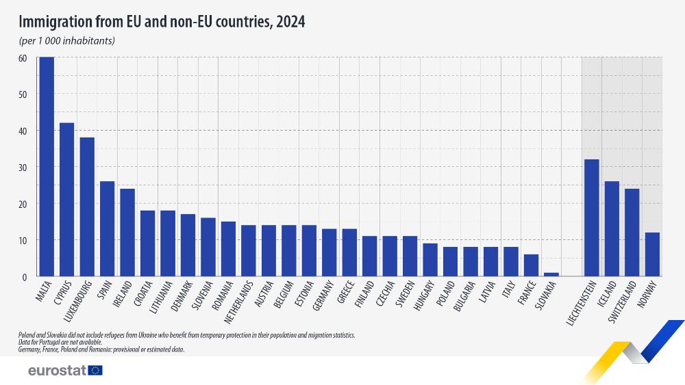 Σε σχέση με το μέγεθος του μόνιμου πληθυσμού, η Μάλτα κατέγραψε το υψηλότερο ποσοστό μετανάστευσης από χώρες της ΕΕ και τρίτες χώρες το 2024 (60 μετανάστες ανά 1 000 κατοίκους), ακολουθούμενη από την Κύπρο (42) και το Λουξεμβούργο (38).