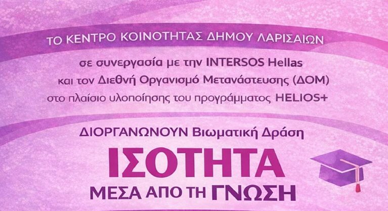 Το Κέντρο Κοινότητας Δήμου Λαρισαίων (συνεχιζόμενες δομές) της Διεύθυνσης Κοινωνικής Πολιτικής και Πρόνοιας, σε συνεργασία με την INTERSOS Hellas και τον Διεθνή Οργανισμό Μετανάστευσης (ΔΟΜ), στο πλαίσιο υλοποίησης του προγράμματος HELIOS+, διοργανώνουν βιωματική δράση με τίτλο «Ισότητα μέσα από τη γνώση», με στόχο την ανάδειξη της σημασίας της εκπαίδευσης στην ενδυνάμωση της γυναίκας και του ρόλου της στη σύγχρονη κοινωνία.