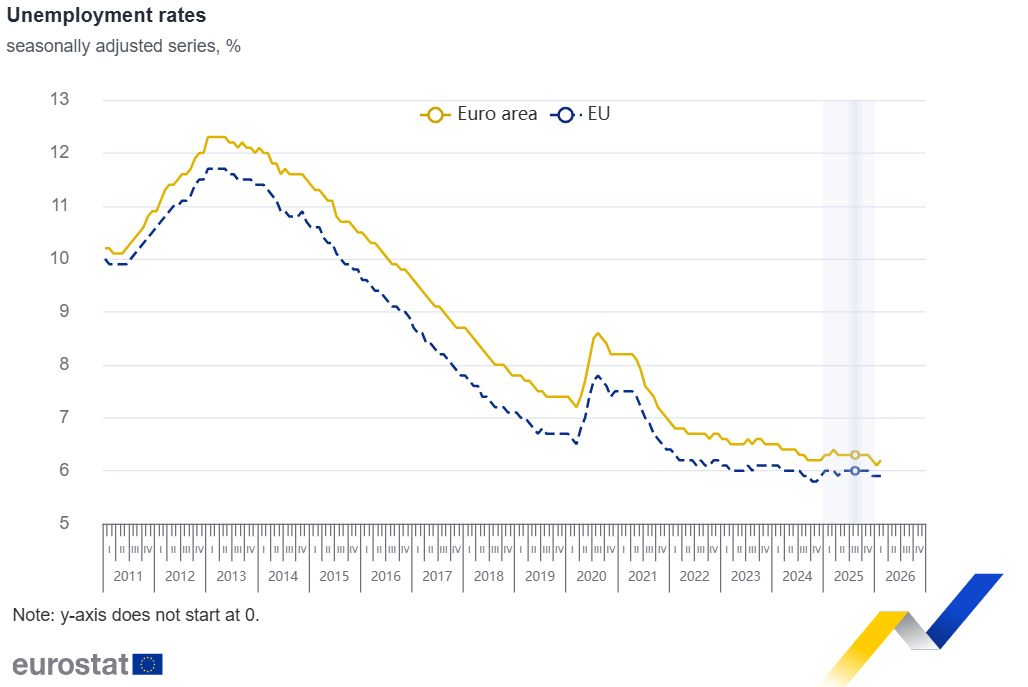 Τον Φεβρουάριο του 2026 το εποχικά διορθωμένο ποσοστό ανεργίας στη ζώνη του ευρώ ήταν 6,2 %, από 6,1 % τον Ιανουάριο του 2026 και από 6,3 % τον Φεβρουάριο του 2025. Το ποσοστό ανεργίας στην ΕΕ ήταν 5,9 % τον Φεβρουάριο του 2026, σταθερό σε σύγκριση με τον Ιανουάριο του 2026 και μειωμένο από 6,0 % τον Φεβρουάριο του 2025. Τα στοιχεία αυτά δημοσιεύονται από την Eurostat, την υπηρεσία στατιστικής της Ευρωπαϊκής Ένωσης.