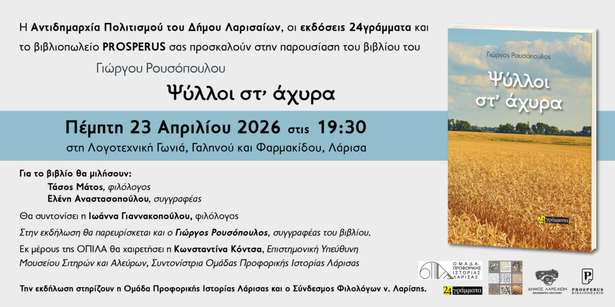 Το βιβλίο του Γιώργου Ρουσόπουλου «Ψύλλοι στ’ άχυρα», παρουσιάζουν την Πέμπτη, 23 Απριλίου 2026, στις 7.30 το απόγευμα, στη Λογοτεχνική Γωνιά, Γαληνού και Φαρμακίδου, Λάρισα, η Αντιδημαρχία Πολιτισμού του Δήμου Λαρισαίων, οι εκδόσεις 24γράμματα και το βιβλιοπωλείο PROSPERUS.